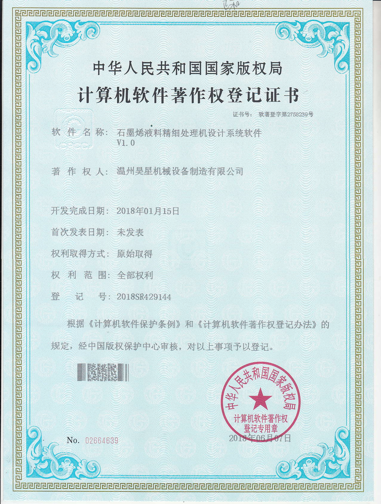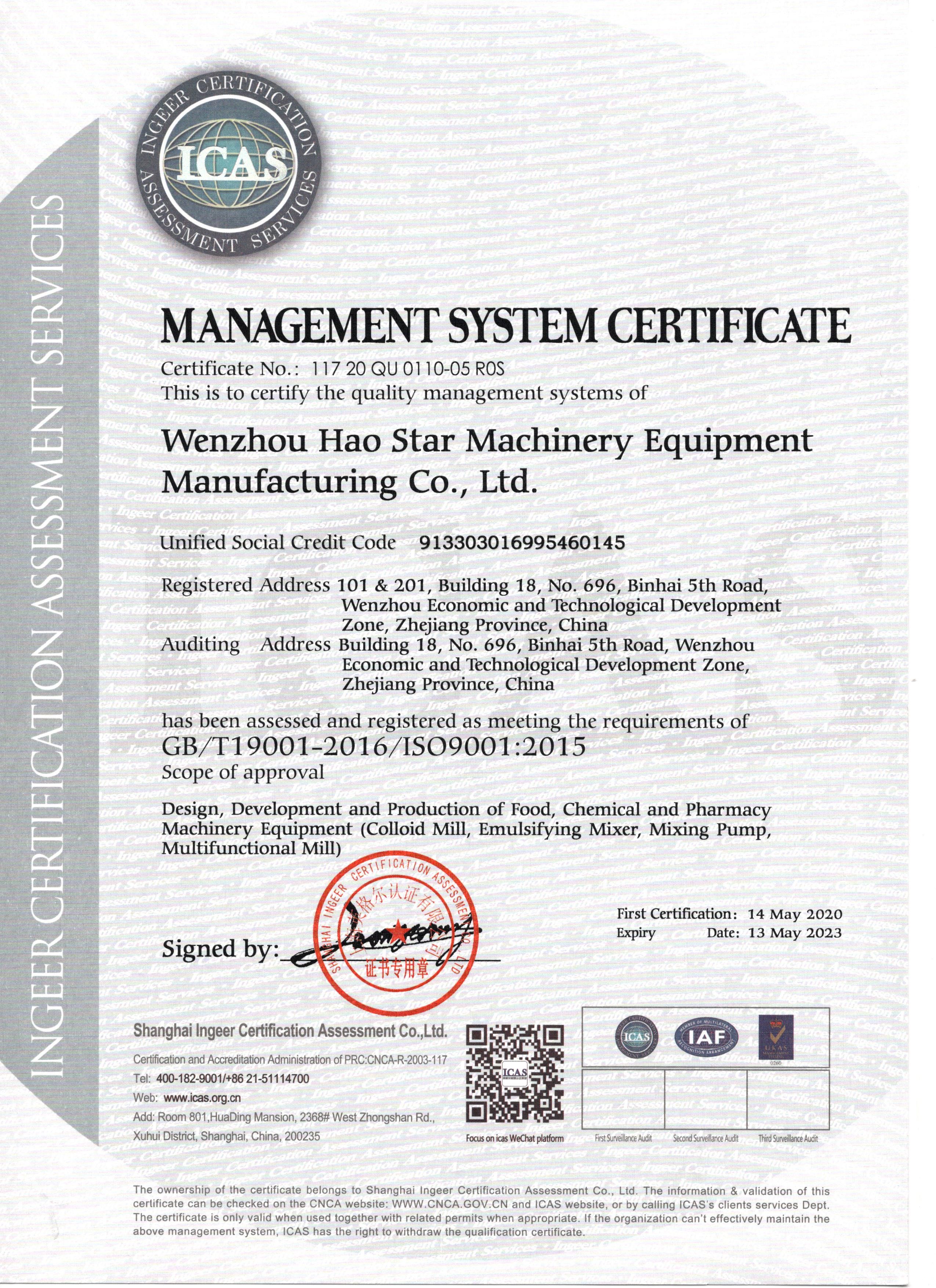 昊星科技是中國發明協會、中國質量監督檢驗協會、中國食品和包裝機械工業協會、溫州機電技術協會、食品制藥機械行業協會、中國食品制藥機械生產基地等成員單位,公司系原溫州市七星乳品設備廠大股東創建的。產品ISO9001認證、執行Q/WHX0等企標、國標JB和國際標準,2013年期間研發鈦白用微細連續研磨機獲浙江省科學技術成果、開發區2014年度科技成果獎勵、并榮獲全國質量檢驗穩定合格產品、溫州機電行業科技創新型企業; 明星企業家、中國質檢協會先進單位和先進個人會員、溫州機電技術專家,2016年獲得溫州經濟技術開發區科技創新企業、溫州市創新型科技企業、浙江省科技型中小企業、創新型中小企業、國家高新技術企業。